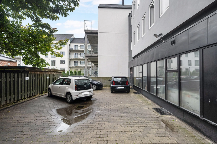 Der er parkeringsmulighed i ejendommens baggård som for nuværende er benyttet af ejendommens erhvervslejere. Endvidere er der inden for 100 meter gode offentlige parkeringsforhold og parkeringshus.