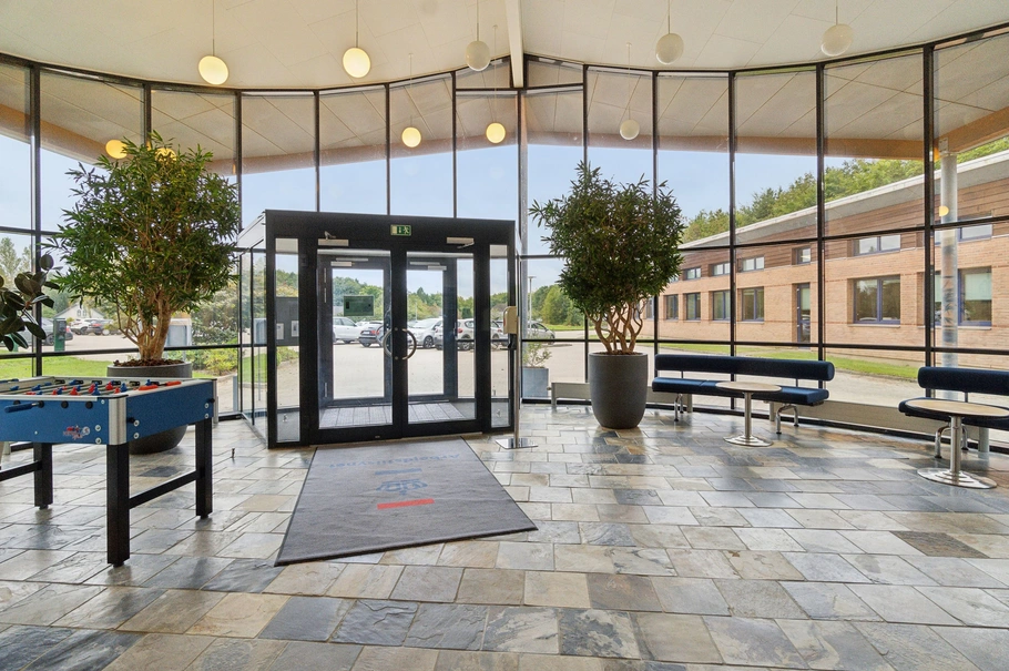 Stort præsentabelt indgangsparti, der fører til kantine / køkken område, eller til en af kontorfløjene. Alle kontorer er varierende, og består således af enkeltmandskontorer, mødelokaler i forskellige størrelser samt storrumskontor. I kontorfløjene findes der i begge ender køkken og toiletfaciliteter.