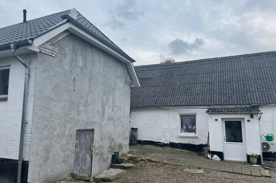 Ejendommen er en pudset bygning, men delvist nyere eternittag. Der er hovedsageligt PVC vinduer i ejendommen.