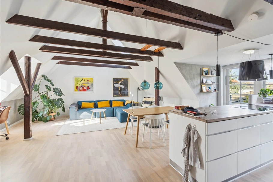 Generelt rummer denne ejendom bare mange fine detaljer. Ejendommen har 4 gode lejemål, hvoraf det ene er en rigtig flot istandsat lejlighed med synlige bjælker i loftet og ikke mindst en fantastisk ugeneret tagterrasse med udsigt over byen.
