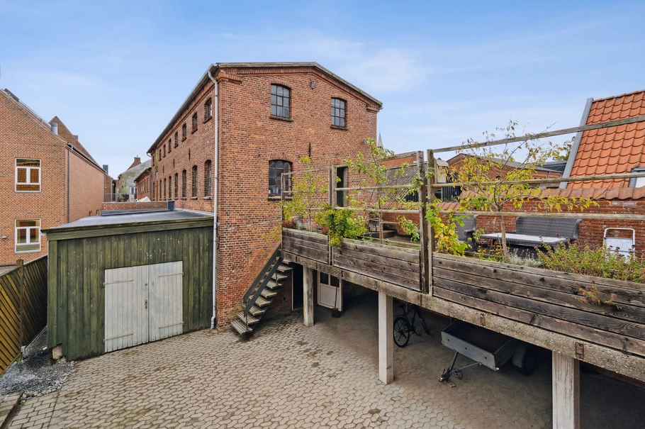 Butikken i stueplan udgør en stor flot butik med god loftshøjde og en flot facade med fremtrædende facadepartier, hvor der er god plads til udstilling og reklame. Udover et stort flot butiksareal, er der mange gode lagerkvadratmeter i forlængelse af butikken. Dele af lageret ligger i en charmerende og autentisk pakhus bygning - hvor der virkelig er mulighed for enten, at indrette kreative rum eller helt nytænke arealerne. På 1. sal over butikken og med facade ud til gågaden, ligger en lejlighed på hele 157 m², en meget flot, velholdt og præsentabel lejlighed med god plads. Der har tidligere været trappeforbindelse mellem butik og beboelse.
