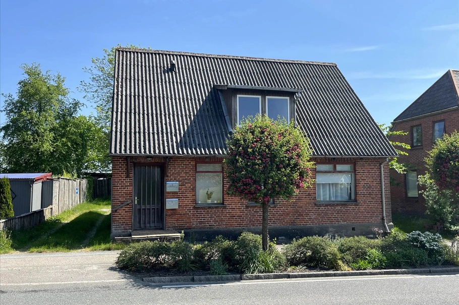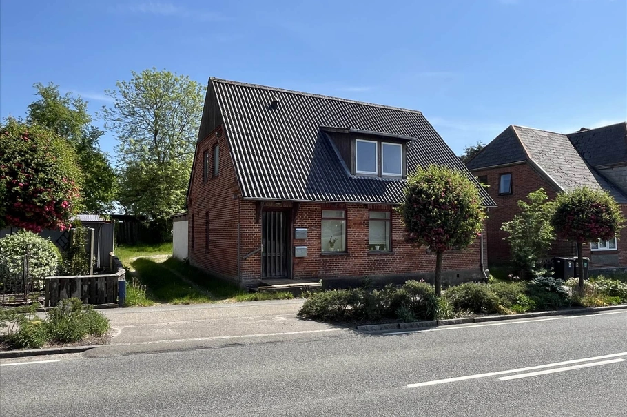 Grunden er 585 m². Ejendommen står med rødstensfacade, bølgeeternit tag, samt trævinduer. Ejendommen trænger til en kærlig hånd.