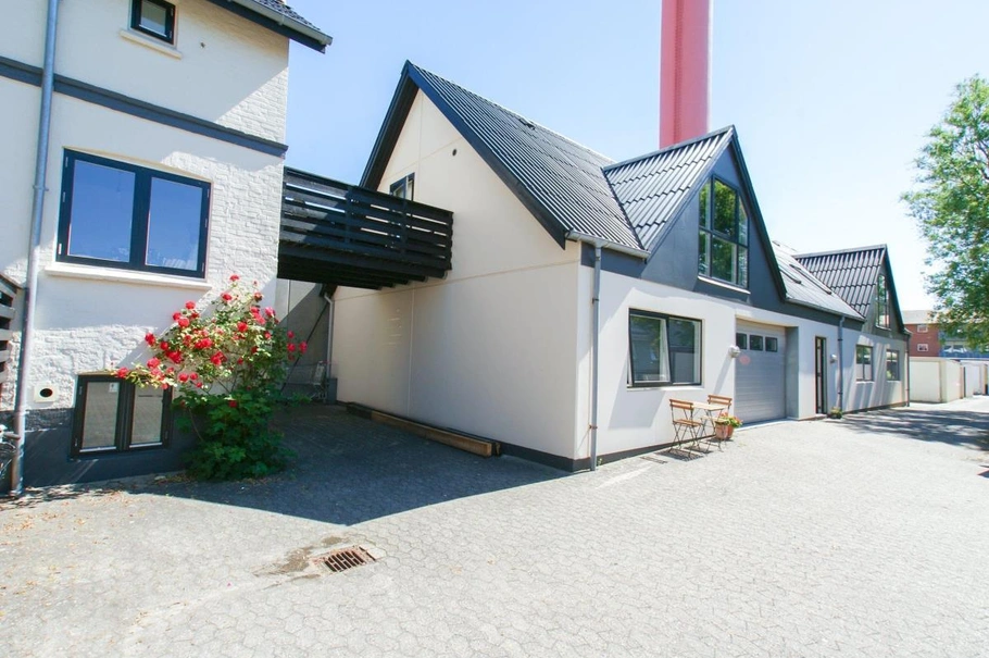 Ejendommens udenomsareal er flisebelagt og tilbyder lejerne privat parkering lige uden for døren.