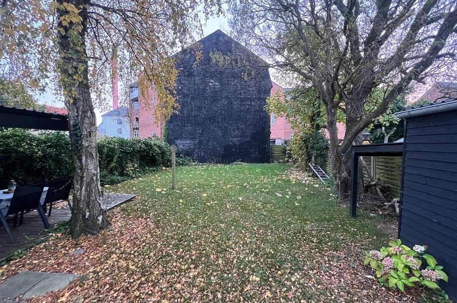 Bagved ejendommen er der privat lukket gårdhave til fælles brug af lejerne samt et tilhørende redskabsrum.