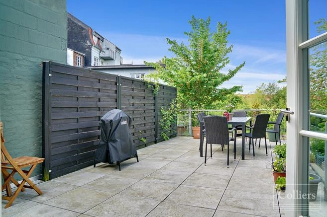 Lejligheden er indrettet over to etager, hvoraf den ene etage er høj stueplan, og den anden etage er delvis kælder, som har niveaufri adgang mod haven.