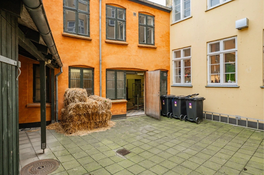 Der er adgang fra gågaden med fordelingsgang til hovedtrappe og baggård.