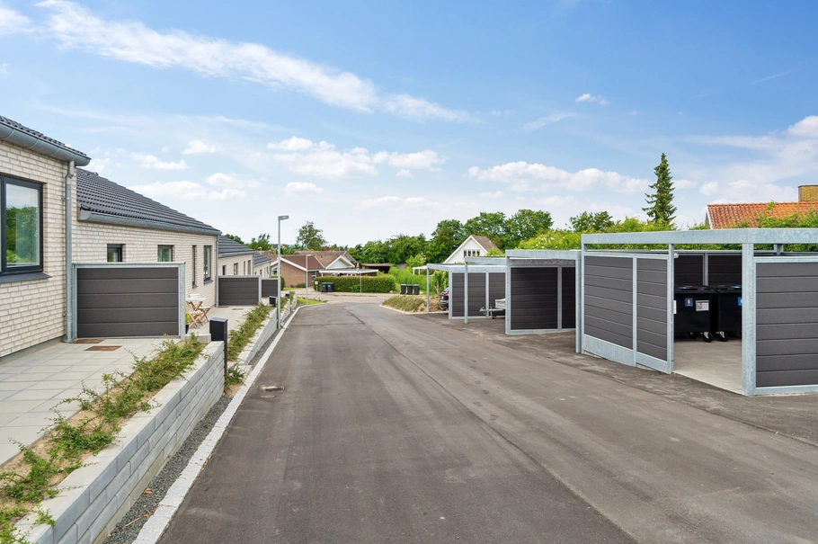 Til rækkehusene hører luksus carporte / udhuse og havehegn fra Lyngsøe.