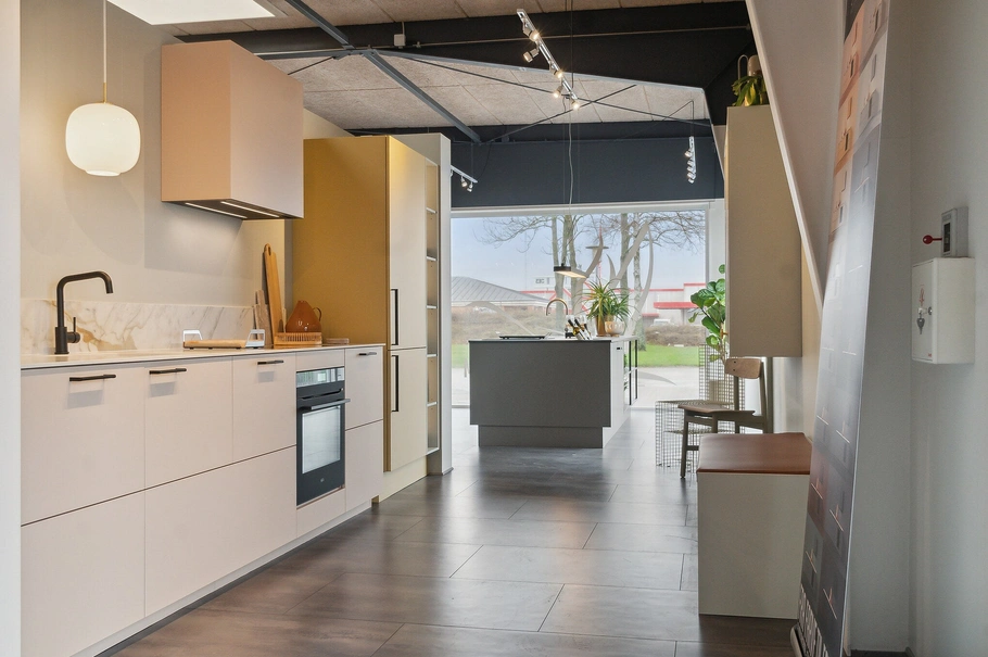Det brede rum har en fordelagtig størrelse, som gør det nemt at indrette nærmest lige den butik eller det showroom, man ønsker, og der er ligeledes fine ovenlysvinduer, som bidrager til den lyse og indbydende stemning i rummet. Her er mange fine detaljer som skillevæggen, så snart man træder ind i lokalet, og det fine gulv, der går igen i både butikslokalet og personalekøkkenet.