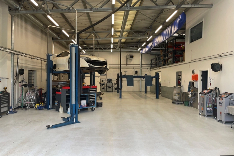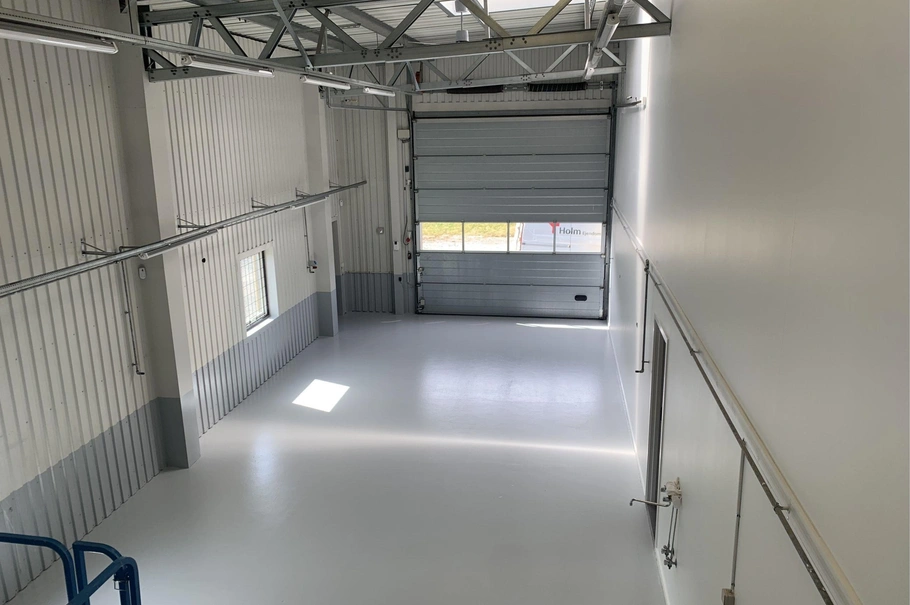 Her er støbte gulve med epoxymaling i værksteder og trægulve i kontorer, LED-belysning, varmepumpe, trykluft, vand, alarmsystem og fiberforbindelse.
