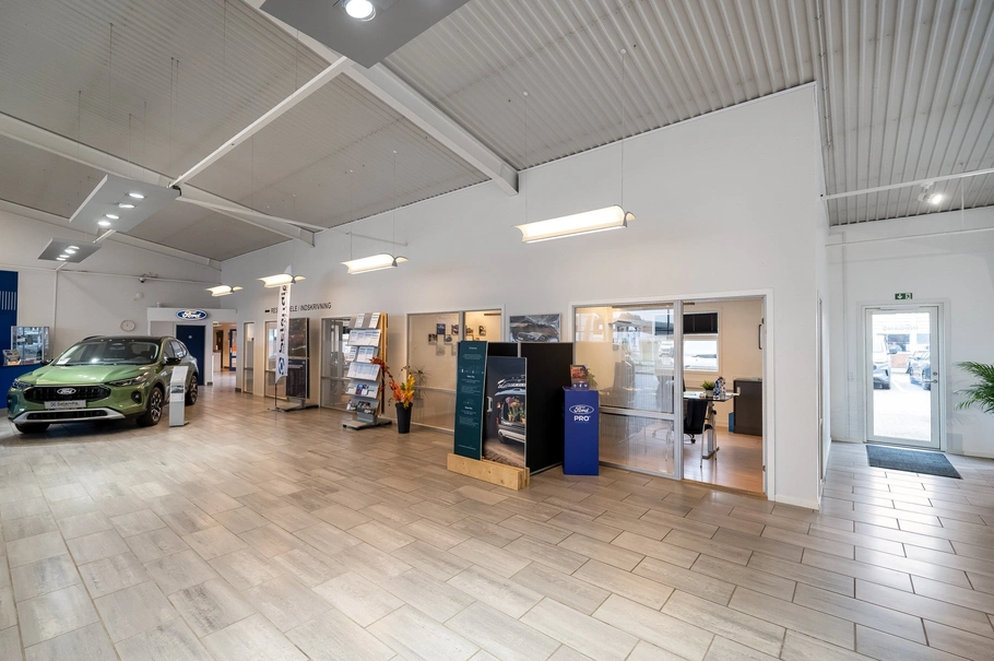 Hovedbygningen, som har facade og indgang mod Huginsvej, er opført til biludstilling med stor glasfacade, klinker på gulvene, højt til loftet samt port mod gården. Bygningen indeholder ligeledes kontorafdeling, indskrivning, cellekontorer mv. Bygningen fremstår yderst præsentabel. I denne del af bygningen findes ligeledes reservedelslager med egen indgang/adgang fra Huginsvej.
