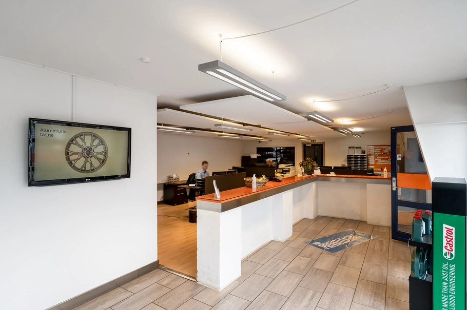 I forlængelse med hovedbygningen findes et stort højloftet værksted med direkte adgang til reservedelslager og kontorafdelingen og med tilhørende personale- og omklædningsfaciliteter. Desuden er der adgang til yderligere to mindre værksteder bagerst i bygningen, som pt. benyttes til klargøring. Alle med adgang via porte. Værkstedet er udstyret med lifte, udsugning og meget andet. I gården, bag hovedbygningen, er et større befæstet areal til parkering mv.