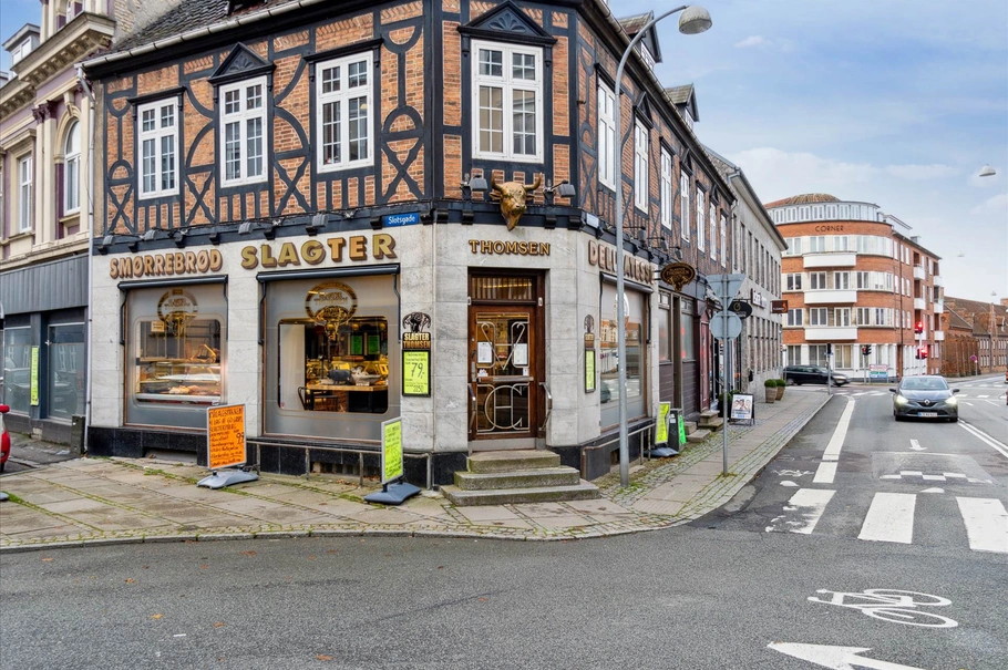 Sælger har selv drevet slagterforretningen i mange år inden den blev solgt til nuværende lejer i ejendommen. Det andet erhvervslejemål er frisørsalon med egen indgang næst Restaurant Flammen og Sparekassen Kronjylland.