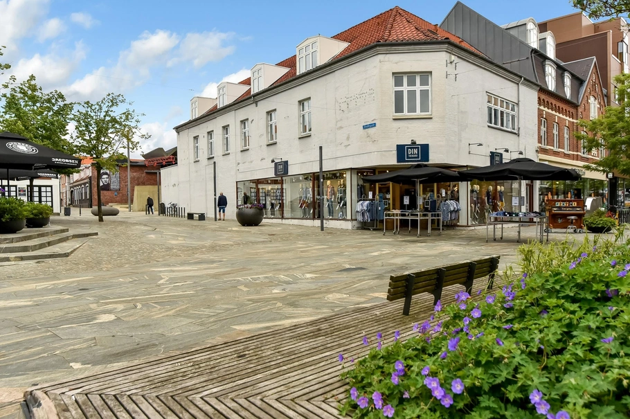 Ejendommen ligger midt på byens gågade - ved Poulsens Plads og lige i 'smørhullet' i forhold til handels- og byliv - og er dermed et meget eftertragtet område for både erhvervs- og boliglejere med historisk lav tomgang.