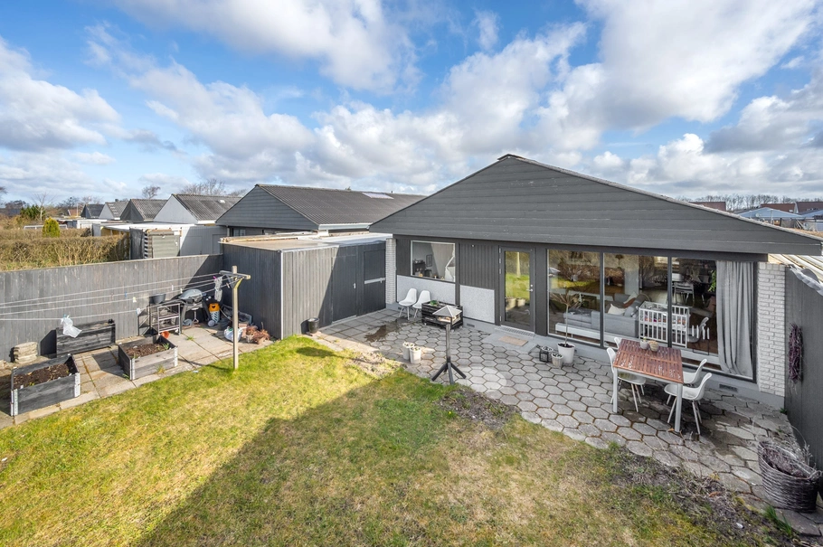 Beliggende på 306 m² grund, der er udlagt med flisebelagt indkørsel og ellers aflukket have med mindre græsplæne og flisebelagt terrasse.