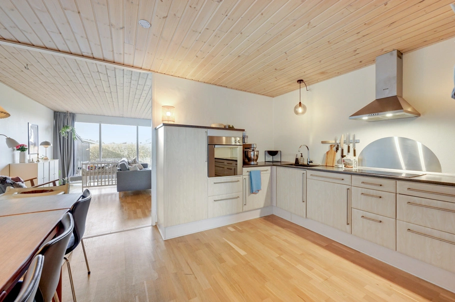 Entré med godt lysindfald - værelse - pænt badeværelse med bruser, klinkegulv og gulvvarme. Opholdsstue med lyst laminatgulv og med stort vinduesparti og udgang til haven. Pænt rummeligt køkken med god spiseplads (i åben forbindelse med stuen). Soveværelse med walk in-closet samt eget pænt badeværelse, ligeledes med klinkegulv med gulvvarme og bruser.