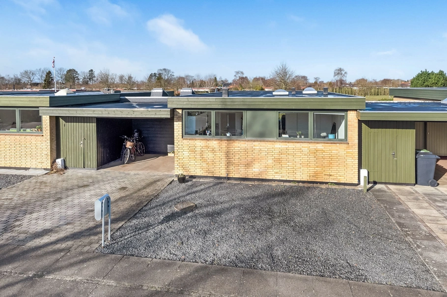 Rækkehusbyggeriet er fra 1965, og huset tæller 109 kvadratmeter under tag. Her er både privat carport og et indbygget værksted samt et træbeklædt skur.