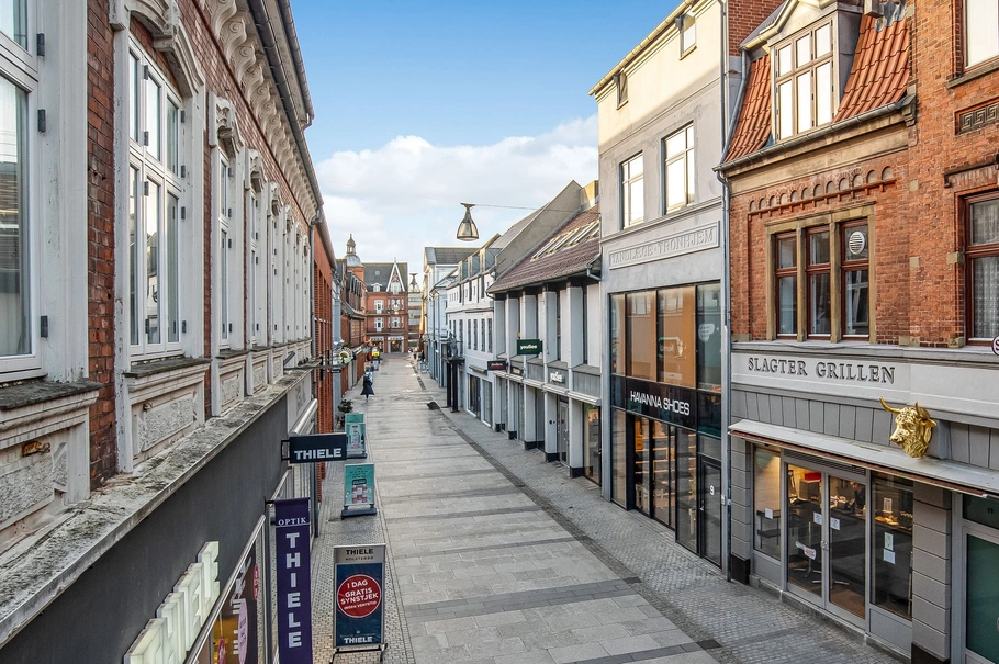 Ejendommen er beliggende på byens gågade og med en af de bedste placeringer på denne gågade.