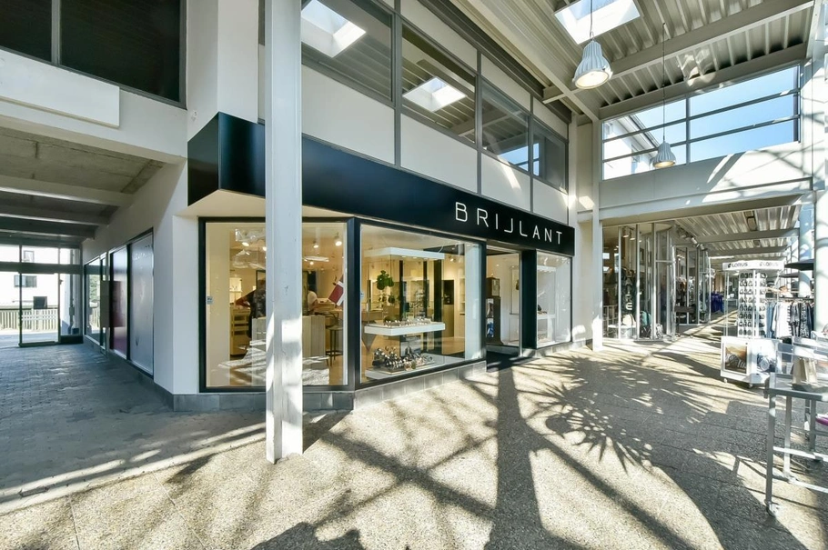 Butikken i stueplan har store udstillingsvinduer ud mod det overdækkede strøgcenter.