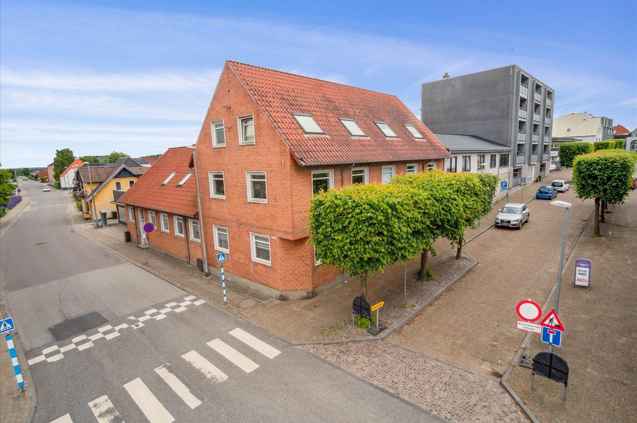 Ejendommen består af to bygninger, hvoraf den ene er en mindre enhed, der pt. er udlejet til frisørvirksomhed. Den anden bygning er en større enhed med to erhvervslejemål i bunden samt syv lejligheder fordelt på en flot hjørneejendom.