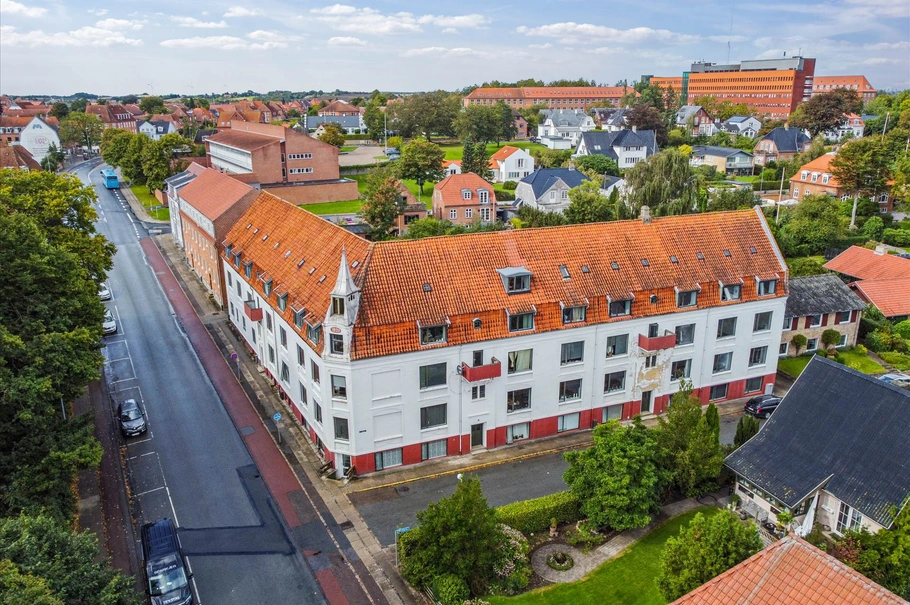 Denne spændende ejendom er opført i 1920 og var oprindelig tiltænkt af skulle have været hotel – men blev i stedet indrettet med boliger og butikker. I dag fremstår ejendommen som en ren boligudlejningsejendom med 24 boliger, hvoraf en kælderlejlighed skal genopbygges.
