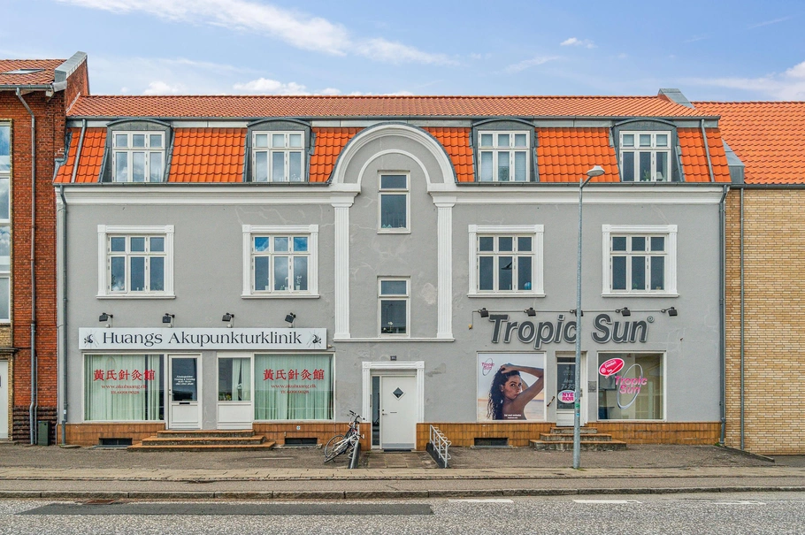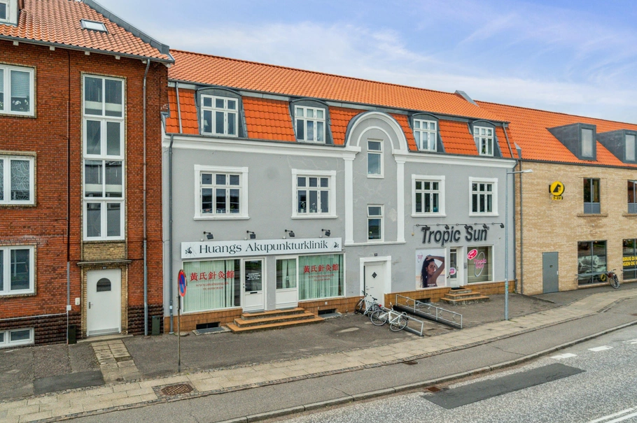 Forbygningen er i 2,5 plan indeholder skønhedsklinik samt solcenter i tagetagen samt 4 beboelseslejligheder på 1. og 2. sal.