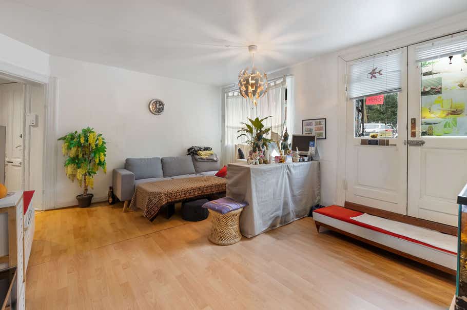 Fra gaden er der kun 2 trin ned til ejerlejlighedens egen indgang med dobbelte døre. Herfra træder man ind i et stort, lyst og og indbydende lokale med stort vinduesparti mod Pile Allé. Derudover indeholder ejerlejligheden 3 regulære separate rum, toilet og køkken. Fra køkkenet er der adgang til ejendommens bagtrappe, hvorfra man kan komme ud i ejendommens hyggelige gård.