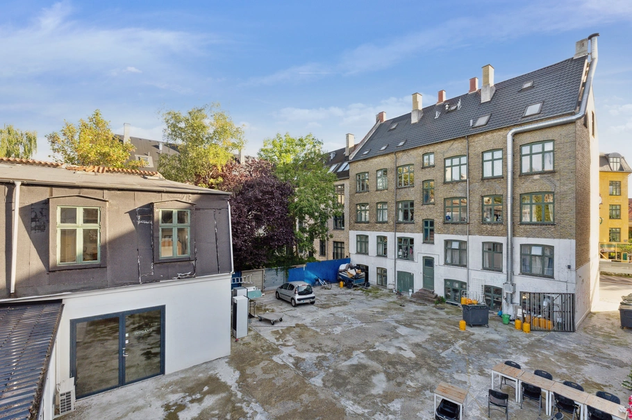 Det er muligt at køre ind i gården, som er lukket med elrulleport ved vejen.