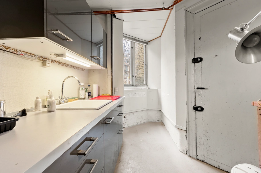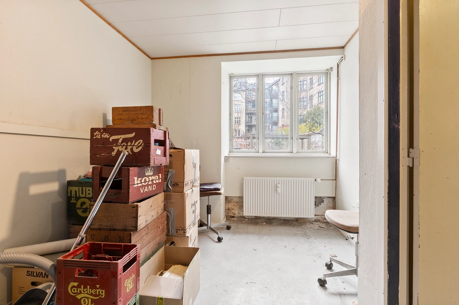 Hertil er der køkken med adgang til bagtrappe med udgang til gården, yderligere finder du mindre depotrum/garderobe samt toilet med bad.