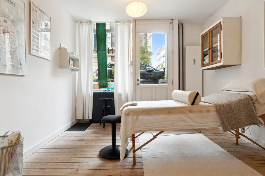 Bemærk, at hvis du gerne vil dele lokalerne, kan indgangen via ejendommens opgang benyttes, så f.eks. hvert lokale kan anvendes til klinik-/behandlerlokale, uden at man skal gå forstyrrende igennem det forreste lokale.