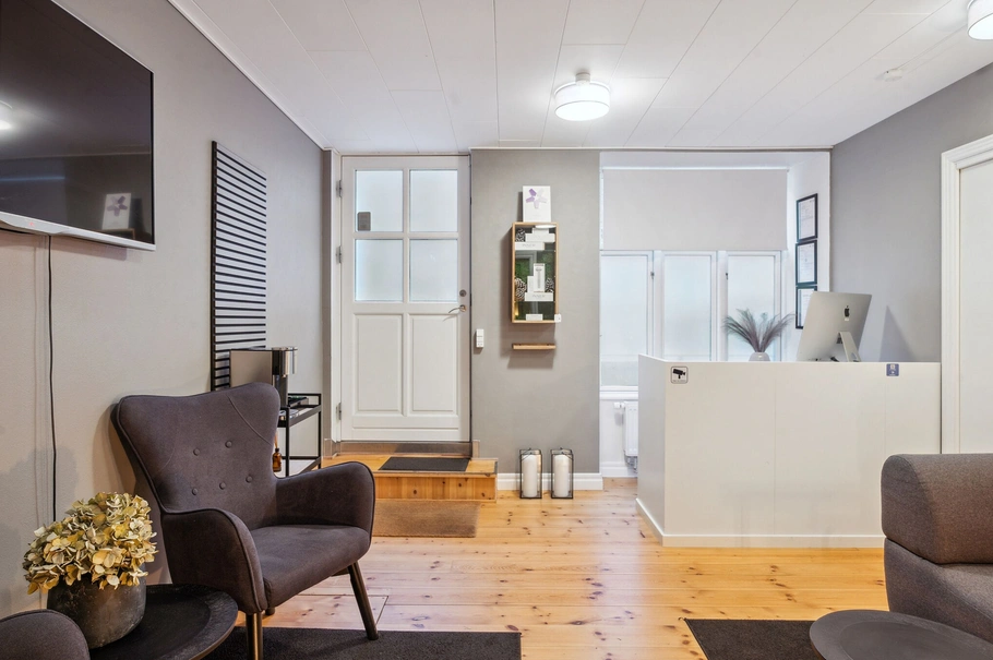 På Indre Østerbro, nærmere bestemt på mezzaninen på Willemoesgade 29, udbyder vi nu denne erhvervslejlighed på 167 kvm, som også har en 80 kvm kælder, der er registreret som lager. Lejligheden er flot istandsat og benyttes i dag til beauty-klinik, men er oplagt som kontor til diverse liberale erhverv.