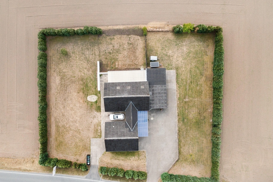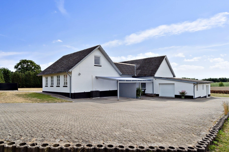 Ejendommen indeholder i dag et landbrugsareal på ca. 31.000 m² som er forpagtet ud på et-årige aftaler samt yderligere areal med en 2 families ejendom på samlet 229 m² med tilhørende garagebygninger på 64 m². Denne ejendom kan enten udmatrikuleres selvstændigt - eller rives ned for at give plads til yderligere nye boliger. Den ene lejlighed overtages med lejer, mens den anden vil være til købers disposition - fx til byggelederkontor under byggeriet. Ejendommen opvarmes i dag med varmepumpe.