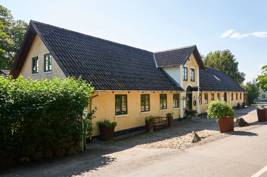 Det hele ligger på stor grund med store gamle træer og med gode parkeringsmuligheder for både biler og busser.