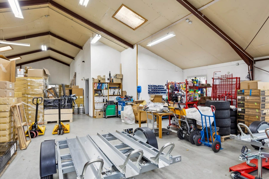 Lager/produktionshal er et stort lokale med hejseport i gavl. Lokalet opvarmes med oliekalorifere.