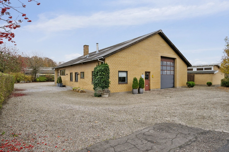 Erhvervsdelen indeholder: Garagebygning i stålplader med loft til kip. Stort værksted med støbt gulv, hems, depotrum, selvstændigt kontor, toilet og bad.En dejlig ejendom med mange gode anvendelsesmuligheder.