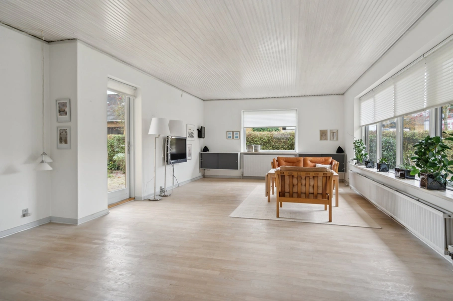 Villaen som overalt fremstår pæn og velplejet indeholder: Entré med klinkegulv, fordelingsgang med adgang til pænt spisekøkken med Multiform køkken og alt i hårde hvidevarer, dejlig stor lys stue med flot parketgulv, udgang til terrassen og skydedør til en hyggelig spisestue ligeledes med flot parketgulv, stort værelse som opr. har været 2 værelser, badeværelse med kar, bruseniche og mosaikgulv, kontor/værelse, godt værelse og mellemgang med skabe, stort bryggers/baggang med bordarrangement, skabe og vaskemaskine, stort disponibelt rum p.t. indrettet som "soveværelse" med skabsvæg og udgang til terrasse og haven. Fra mellemgangen er der nedgang til ca. 10 m2 kælder.