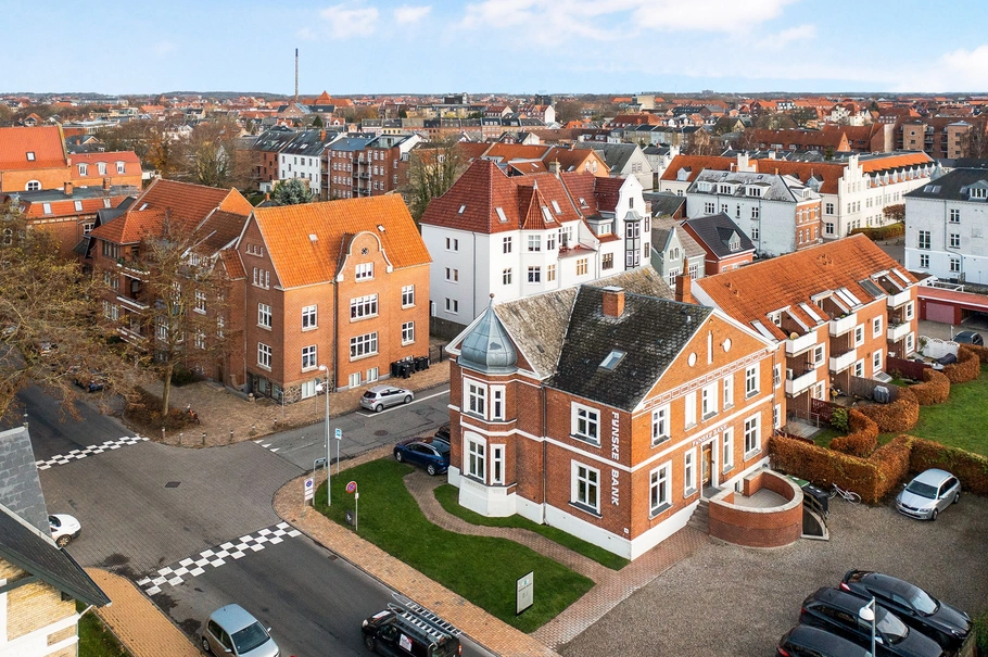 Ejendommen fremstår som en karakterfuld hjørneejendom med flotte detaljer, herskabelige vinduespartier og et markant kuppeltårn, der giver en synlig og repræsentativ profil. En oplagt ramme for virksomheden, der ønsker eksponering og identitet.