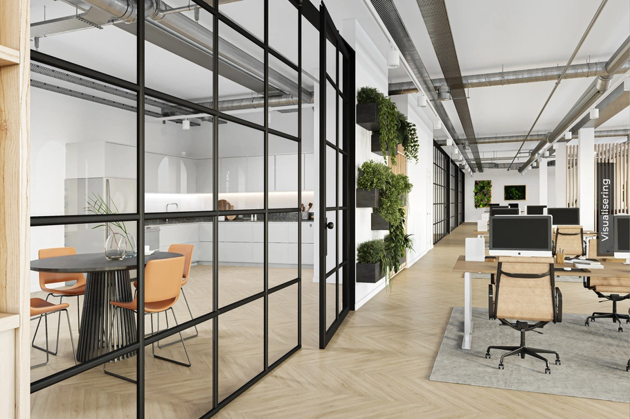 Den flotte kontorejerlejlighed ligger i stueplan og rummer i dag indgangsparti, stor fordeler gang med opholdsområder, fem storrumskontorer/mødelokaler/undervisningslokaler i varierende størrelser, køkken/kantine og toiletfaciliteter. Lokalerne fremstår i pæn og funktionel stand, tilpasset sælgers behov, og kan anvende som de står, eller tilpasses til købers individuelle behov.