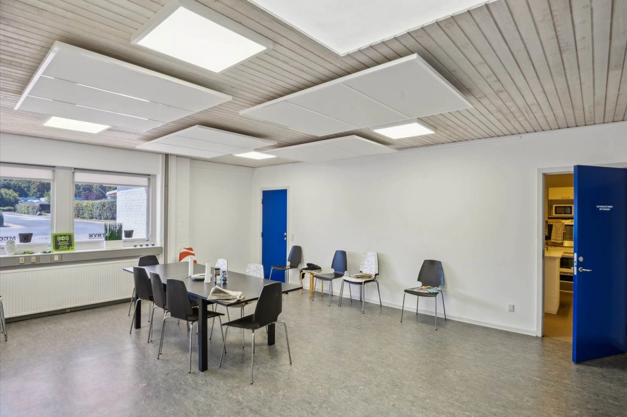 Kontorområdet på ca. 450 m² er moderne og funktionelt indrettet med lyse kontorlokaler, møderum og personalefaciliteter. Dette område giver et behageligt arbejdsmiljø for administrative medarbejdere og ledelse. Der er mulighed for at ændre på planløsningen, hvis man ønsker et større åbent kontorareal, da de fleste vægge er lette gipsvægge.