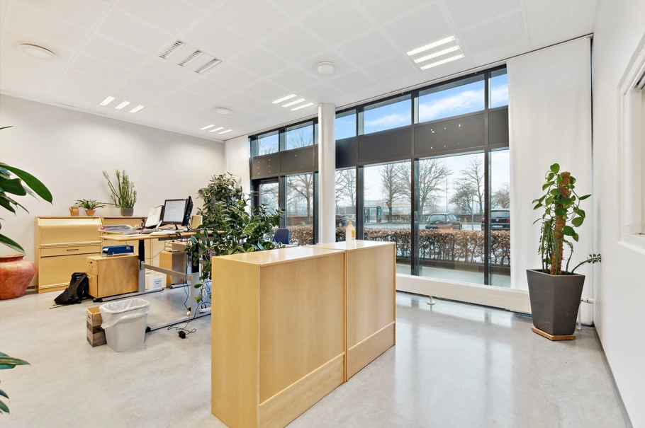 Udenomsarealerne er udlagt til parkering foran ejendommen, varetilkørsel på nordsiden samt grønne græsarealer på den resterende del.