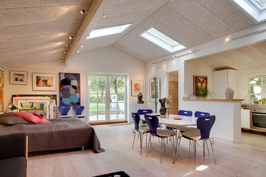 Der er klinker i entré, teknikrum, køkken og badeværelse, mens resten af ejendommens gulvbelægning består af Dinesens brede plankegulv. Der er lyddæmpende troldtekt loftsbeklædning i ejendommen, på nær i badeværelse samt ejendommens midtersektion, som har listeloft. Der er lækkert lysindfald fra de mange ovenlysvinduer.