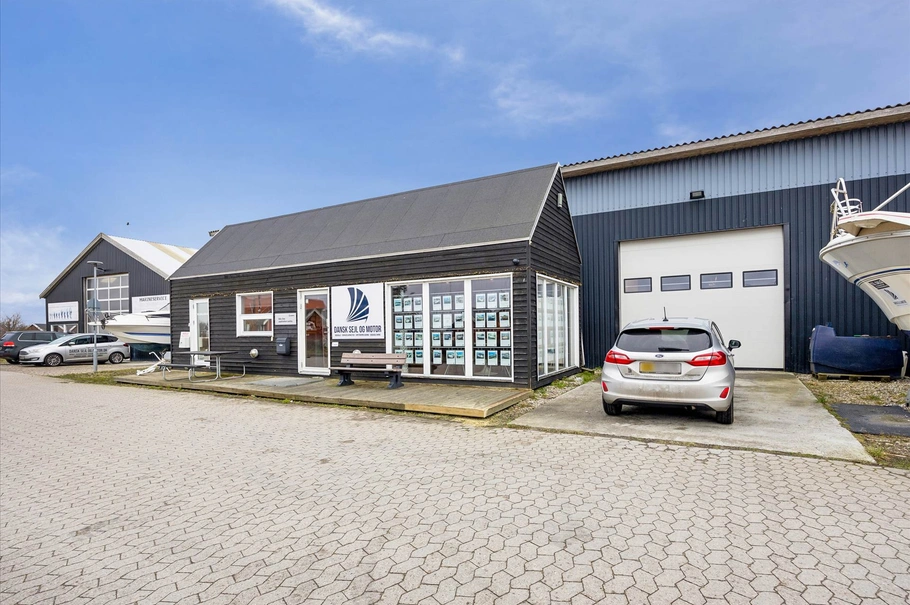 Velholdt lagerejendom med præsentabelt salgskontor i maritime omgivelser.