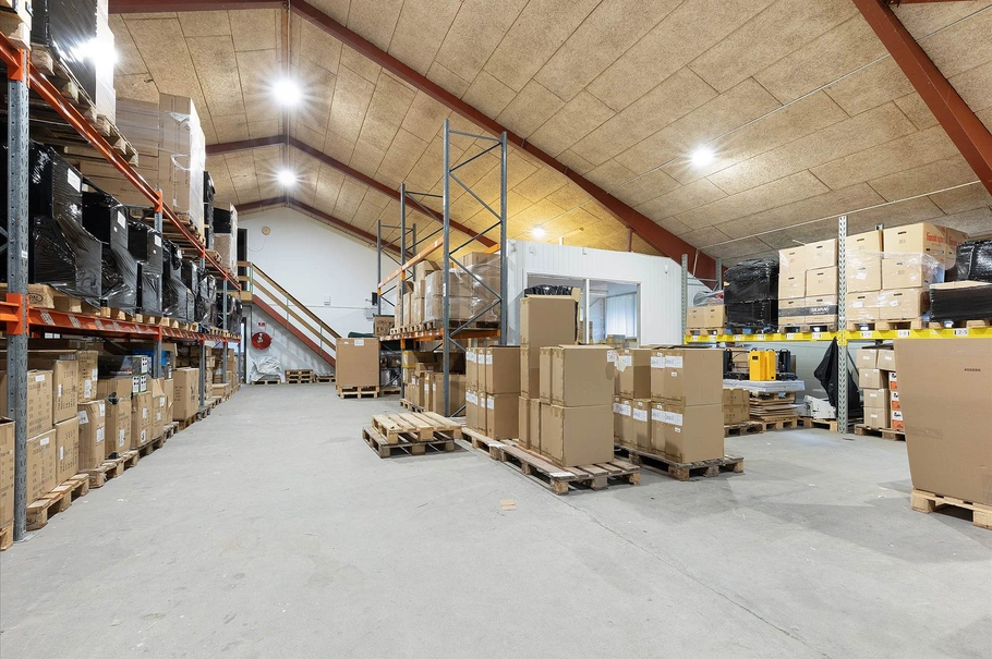 Lagerbygningen er i god stand og opvarmes effektivt med et gasfyr. Der er også mulighed for tilslutning til fjernvarme. Lageret, med en loftshøjde på 5,85 meter ved spær, er udstyret med en ny port fra slutningen af 2023, som måler ca. 2,5 meter. Hallen har troldtekte lofter, er isoleret og inkluderer faciliteter som toiletter, bad og køkken, som dog kræver renovering. Bygningen rummer et fuldt sikringsrum/lokale, som er designet til at sikre værdifulde varer. Hertil er der et indskudt dæk, der bruges som kontor, men det skal bemærkes, at det ikke er godkendt. Lageret er tilgængeligt for store lastbiler.