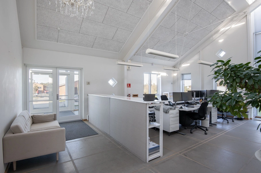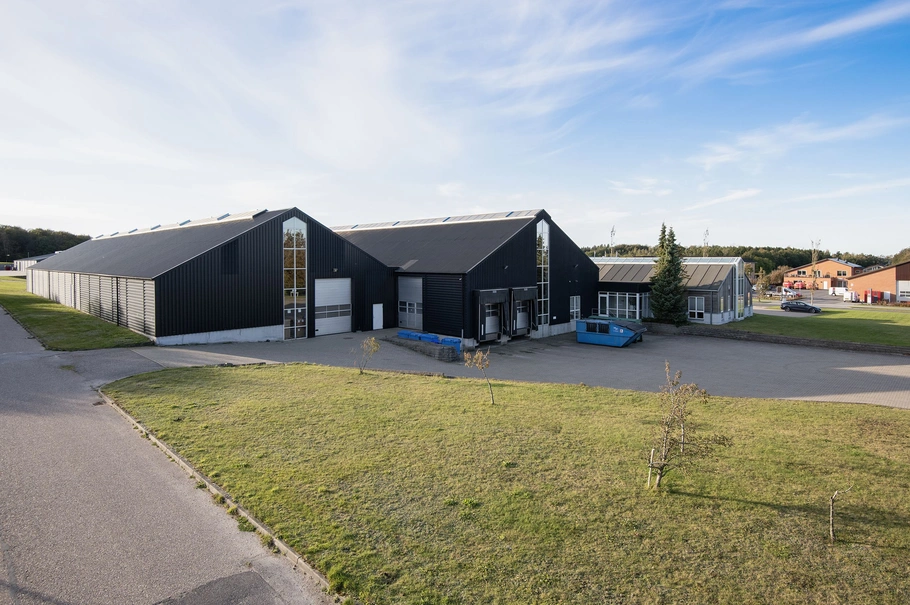 Bygningen er på 5.137 m² og fremstår i særdeles pæn og velholdt stand såvel ind- som udvendigt. Bygningen består af præsentabel indgangsparti hvorfra der er direkte adgang til administrationsafsnit, kantine, showroom og mandskabsfaciliteter.Endvidere er der tilhørende 3 sammenhængende lagerhaller, med rytterlys og troldtektlofter, hvor der er direkte adgang fra administrationsafsnittet.