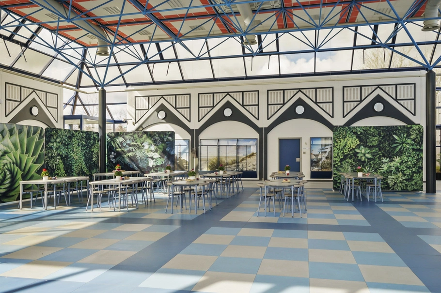 Indretning: Fra præsentabel indgang træder man ind i bygningens samlingspunkt, der er en stor aula (glasoverdækket atriumgård), hvorfra der er adgang til administration med åbent kontor landskab og 3 separate kontorer samt kopirum. I aulaen er der teknikergulv og nedsænket spiseplads ved siden af kantinen, der er i forlængelse af fuldt monteret industrikøkken med kølerum, hvor der også findes depot, forrum og toilet.