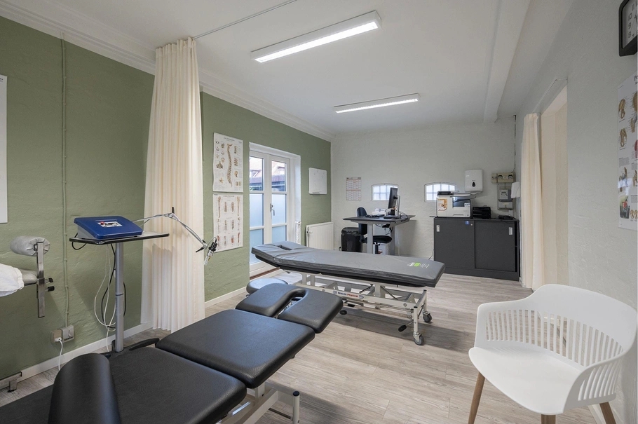 Ejendommen er indrettet med klinik i stueplan - der indeholder vindfang med klinkegulv - toilet med gulvafløb - stort klinik og træningslokale - 2 gode behandlerrum - køkken m.v. Der er udgang til mindre gårdhave fra det ene behandlerrum. Kan anvendes til andet formål.