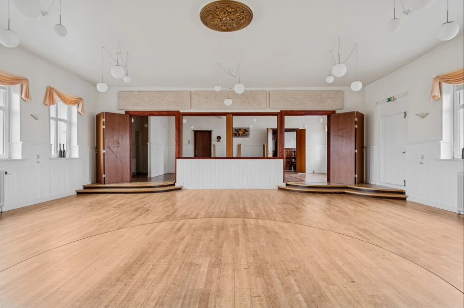Ejendommen rummer også en smuk og rummelig gildesal, som udgør et naturligt centrum for større arrangementer. Her er der god plads til mange mennesker, og salen egner sig perfekt til bryllupper, konfirmationer, fester, møder, kurser og andre typer events. Til ejendommen medfølger desuden service til ca. 200 personer, hvilket gør det nemt hurtigt at etablere selskabsdrift eller udlejning.