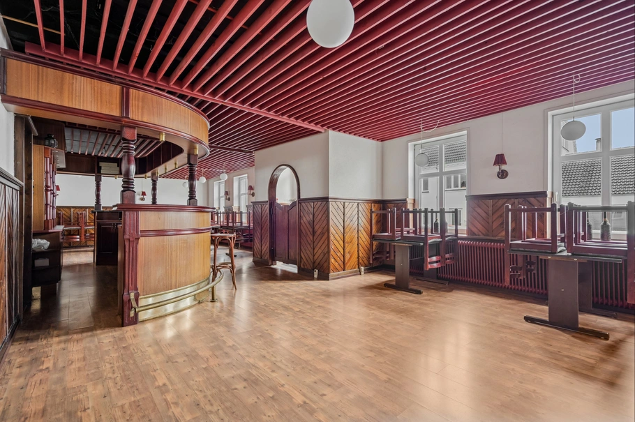 Indgangen åbner op til en flot og rummelig bar, hvor man straks får følelsen af den klassiske krostue med hyggelig atmosfære og varme materialer. Baren er velindrettet og funktionsdygtig, hvilket gør det let at forestille sig sociale arrangementer, receptioner eller mindre selskaber.