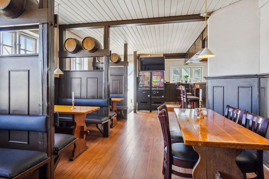 Ejendommen fordeler sig med 172 m² erhverv i stueplan og ca. 69 m² bolig på 1. sal. Bygningen er opført i 1907 og om-/tilbygget i 1991, med en større glastilbygning på ca. 60 m² anvendt til Cafe/Restauration. Den øvrige erhvervsdel har for nuværende karakter af kro/bodega. Der er indrettet krostue med plads til ca. 30 siddende gæster og yderligere 40 spisende i glastilbygningen. Hertil barområde samt større køkken til drift af restauranten. Der vil efter nærmere aftale være mulighed for at overtage nuværende inventar samt bestik mv. til ca. 100 gæster.