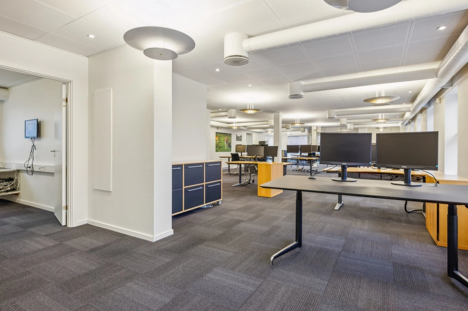 På 1. sal finder du et stort mødelokale, ideelt til morgenmøder og større forsamlinger. Etagen rummer også flere kontorer og en kantine, der skaber en komplet og funktionel arbejdsplads.