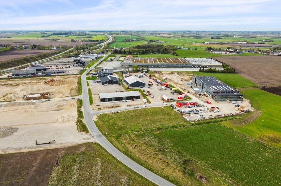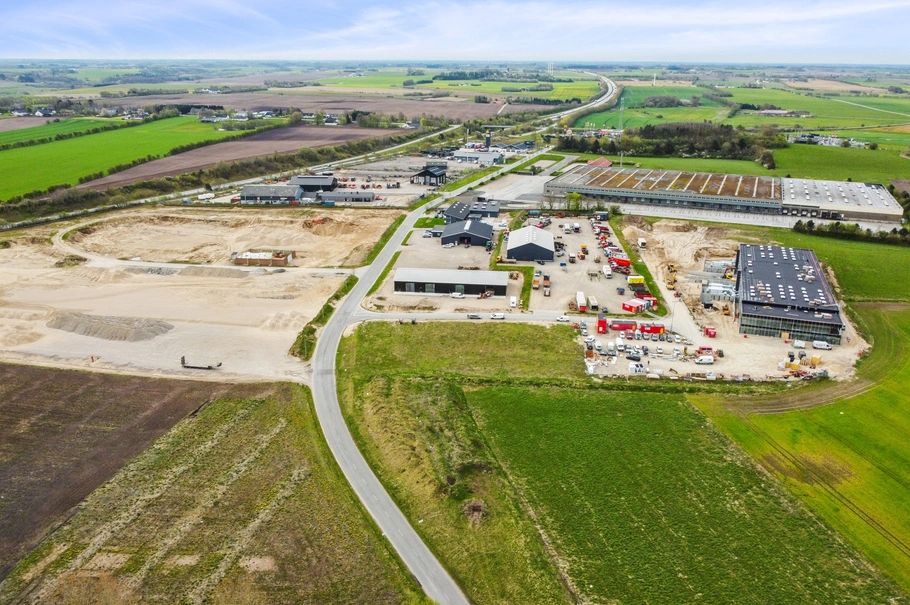 Grundarealet er attraktivt beliggende i et nyere erhvervsområde lige ved motorvej E45.